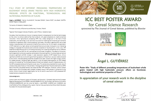 Uno de los trabajos realizados dentro de esta colaboración, se alzaba recientemente con el ICC Best Porter Award (Premio a la Mejor Comunicación) en el congreso internacional ICBC 2021 - 16th ICC Cereal and Bread Congress celebrado hace unos días de manera virtual. El trabajo premiado lleva por título `Study of different presoaking temperatures of buckwheat whole grains treated with high hydrostatic pressure: effects on functional, technological and nutritional properties of flours¿.