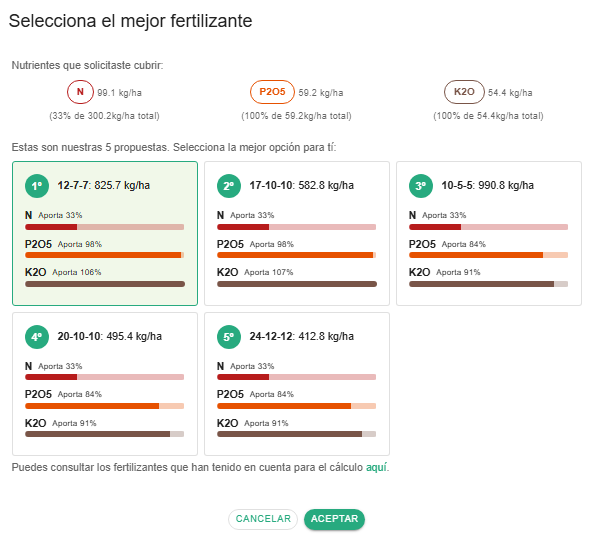 Para satisfacer los requerimientos de nutrientes de los cultivos, Sativum dispone de un asistente para la selección de una combinación óptima de fertilizantes, tanto orgánicos como inorgánicos, adaptada a las necesidades de cada parcela o grupo de parcelas. El balance de nutrientes se realiza conforme a la publicación Fitotecnia: principios de agronomía para una agricultura sostenible e implementa los criterios de las aplicaciones Fertilicalc (F. Villalobos) y Farm Advisory Tool for Nutrients (FAST) de la Comisión Europea, con modificaciones introducidas por el ITACyL.